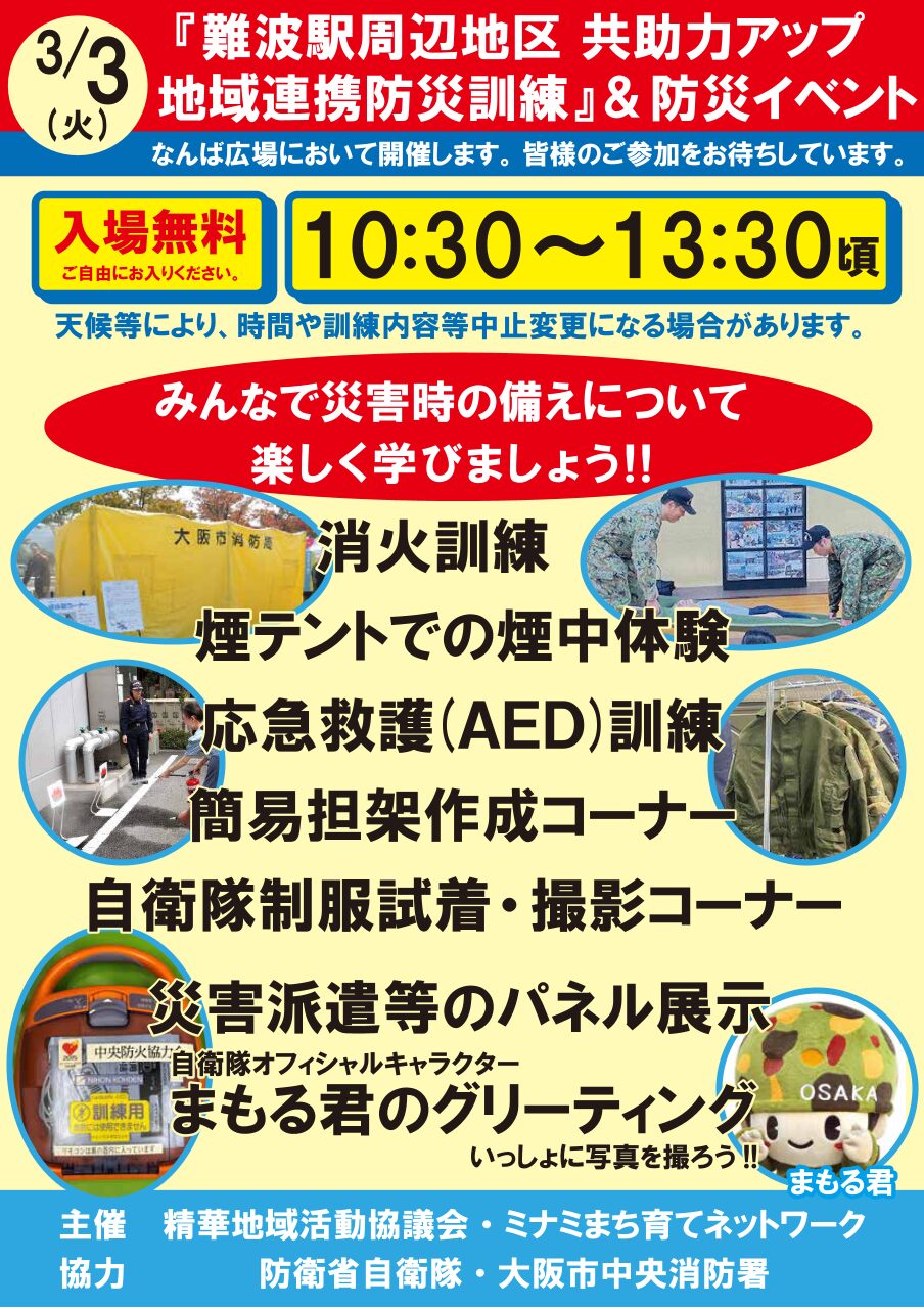 なんば広場にて『難波駅周辺地区 共助力アップ 地域連携防災訓練』&防災イベントを開催します! 3月3日(火)、なんば広場にて『難波駅周辺地区 共助力アップ 地域連携防災訓練』&防災イベントを開催します。消火訓練の他、煙中体験や簡易担架作成、自衛隊の制服試着もできます。自衛隊のキャ…