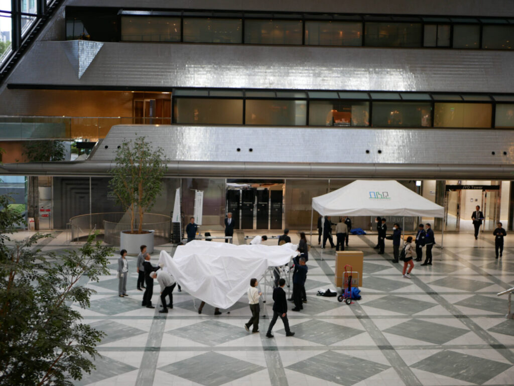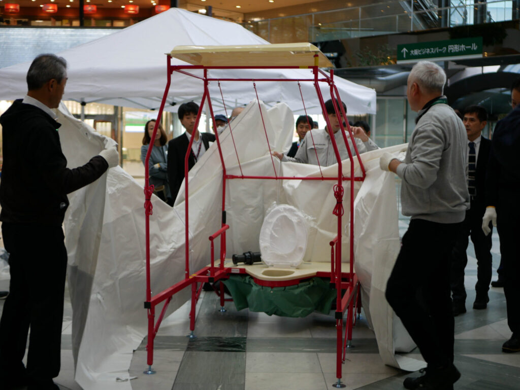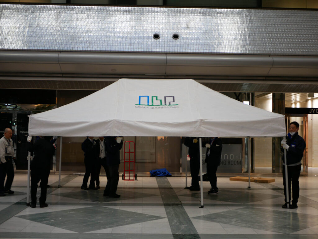 続く第2部では、実際にツイン21アトリウムにて、「テントの設営」および「災害用組立式トイレの設置」 を実動訓練として実施。