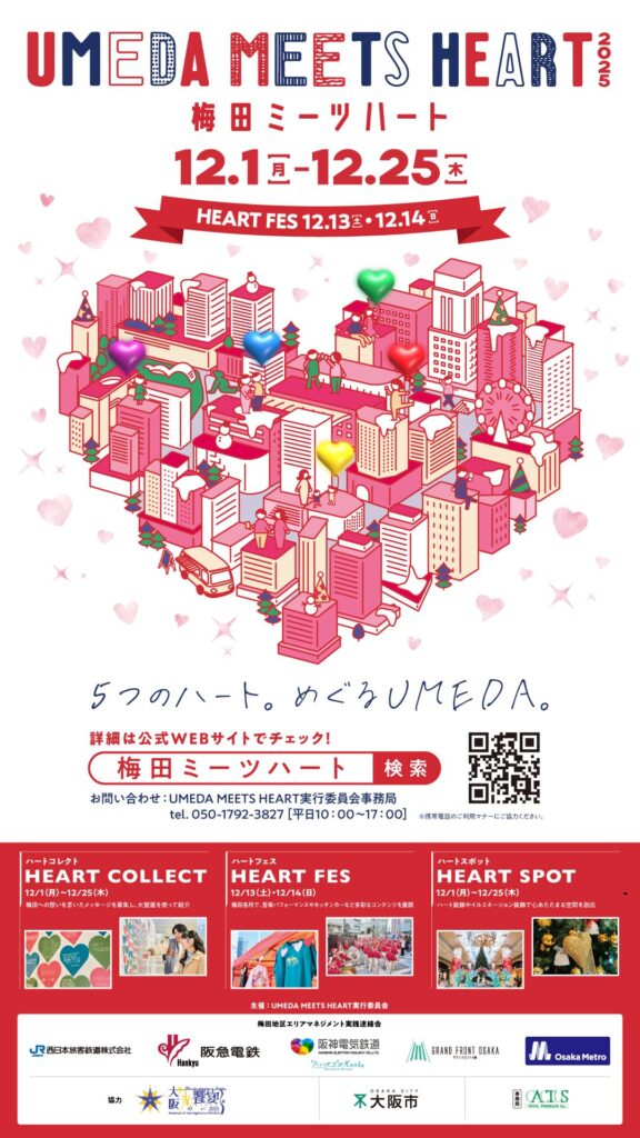 梅田の冬を彩る「UMEDA MEETS HEART 2025」が12月1日~25日に開催されます。今年のテーマは『5つのハート。めぐるUMEDA。』。12月13日~14日には5つのエリアで「HEART FES」を実施し、コンサートやワークショップ、マーチングパフォーマンス、スタンプラリーを楽しめます。また、思い出メッセージを展示する「HEART COLLECT」や、47施設がハートやイルミネーションで装飾する「HEART SPOT」も展開。梅田の魅力を醸成・発信します。